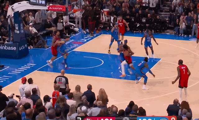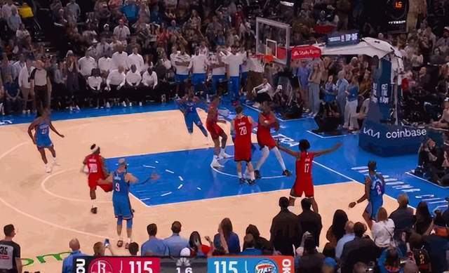 比賽第四節(jié)還剩1分15秒,比分焦灼,火箭由阿門·湯普森持球突進(jìn),正準(zhǔn)備上籃時被亞歷山大貼身防守干擾。慢鏡頭顯示,兩人手臂有接觸,結(jié)果阿門投籃出手偏出,籃球彈筐而出。