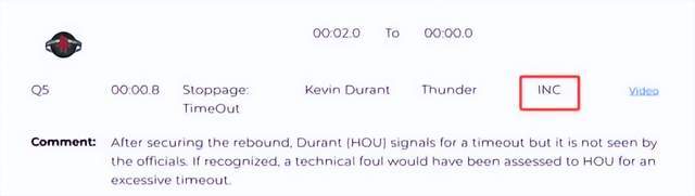 第一加時還剩0.8秒時,火箭杜蘭特在籃下?lián)屜禄@板后,隨后舉手向裁判示意暫停;但問題是,火箭那時早就沒有暫停名額了。
